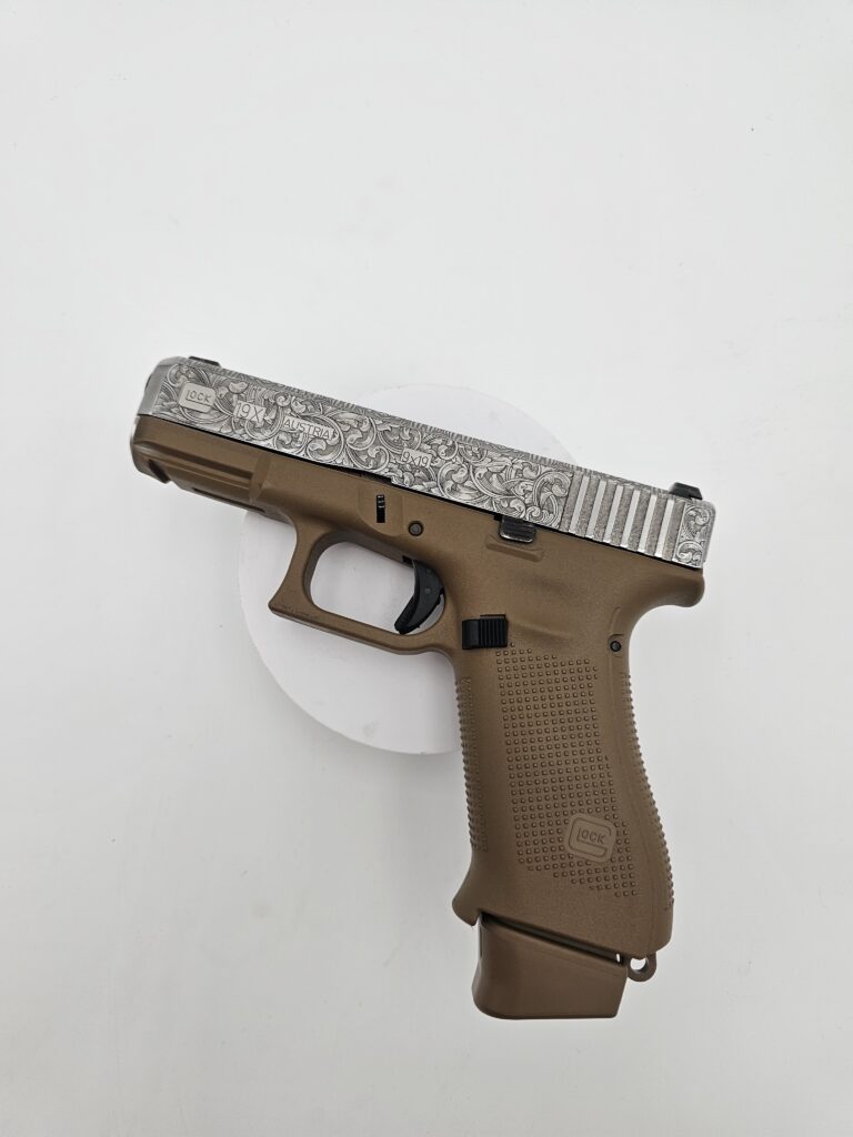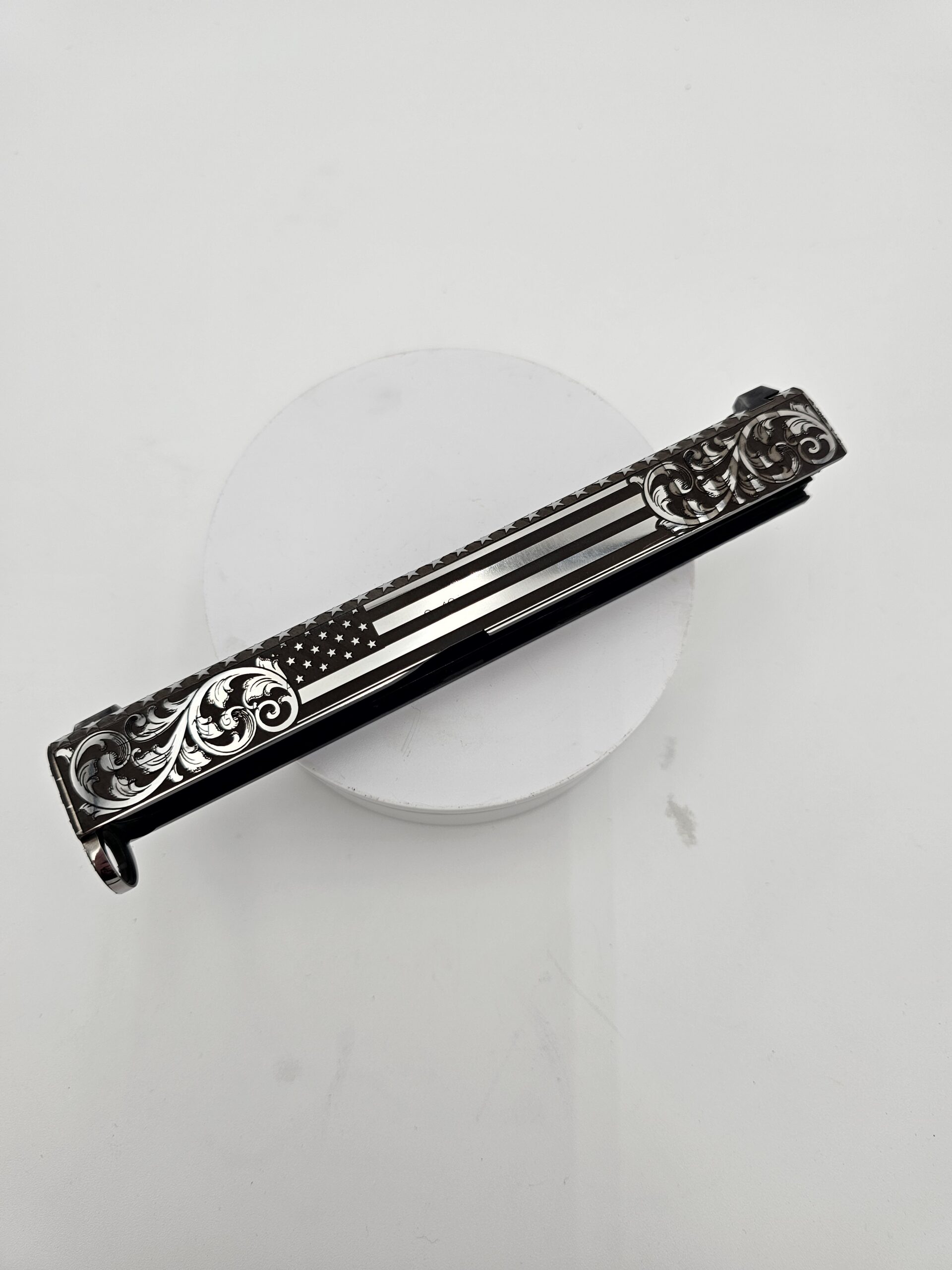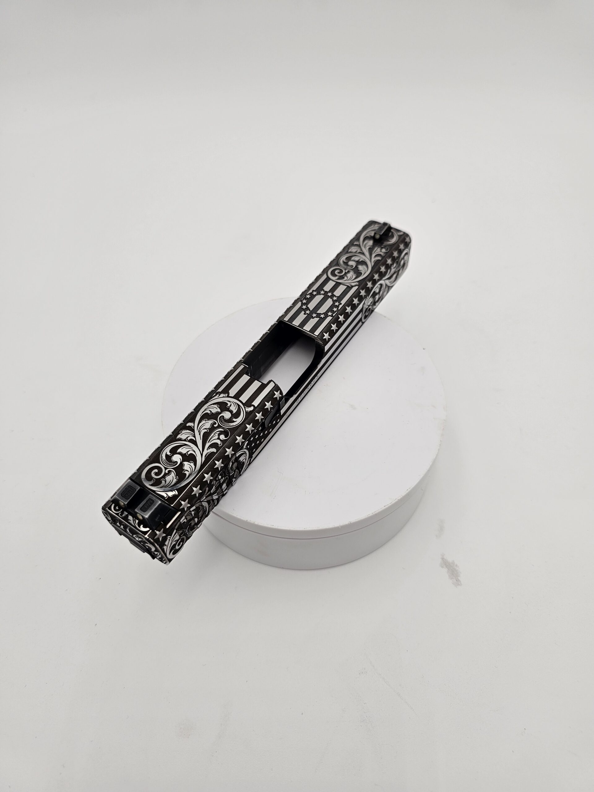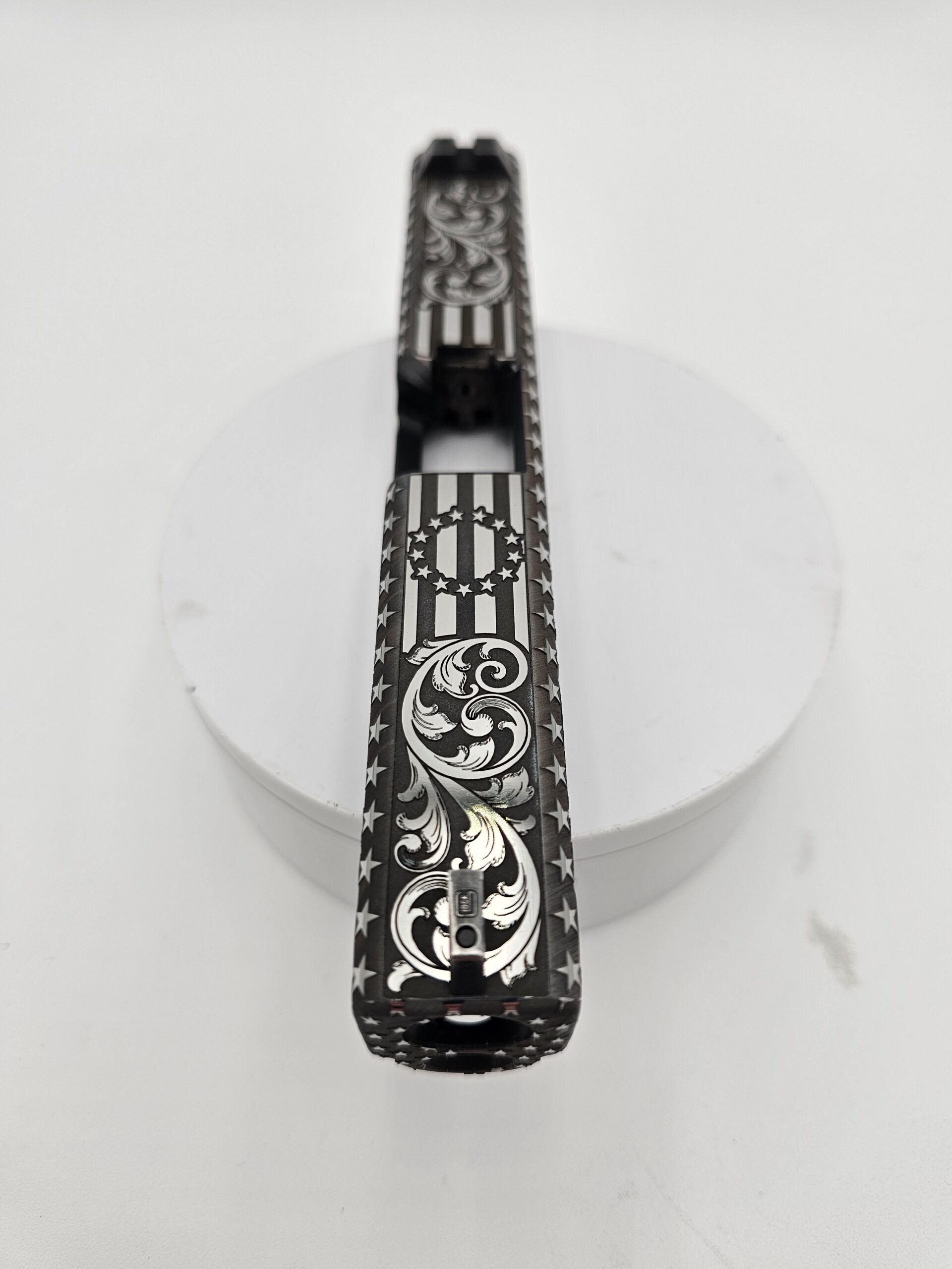 Full-coverage laser engraving on pistol slides. Patriotic patterns, geometric designs, scrollwork, and fully custom artwork — engraved with precision on any metal surface.
