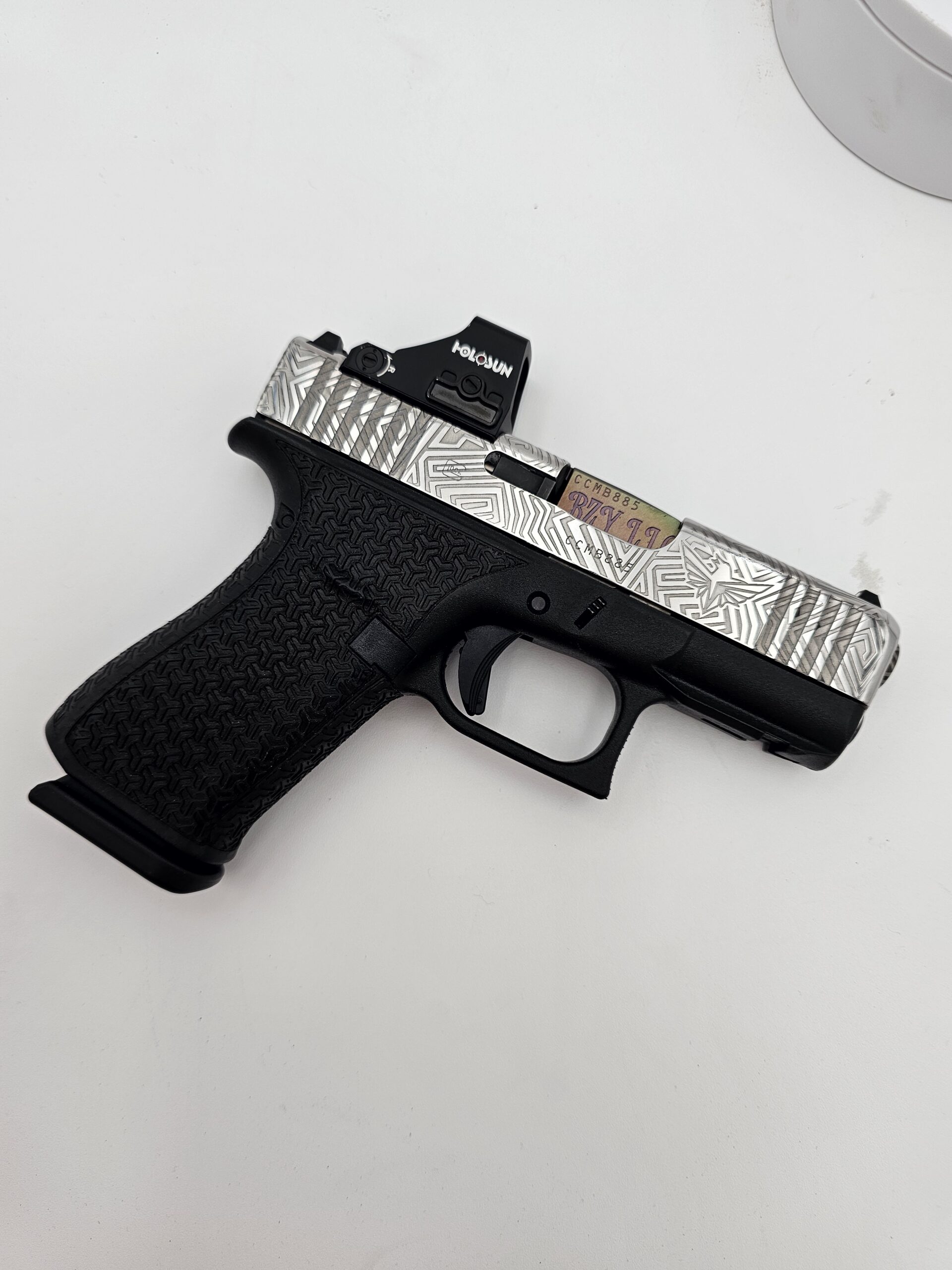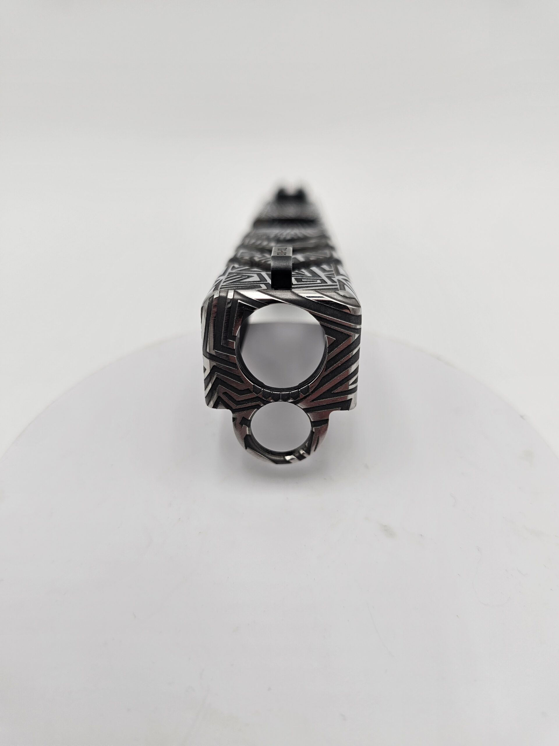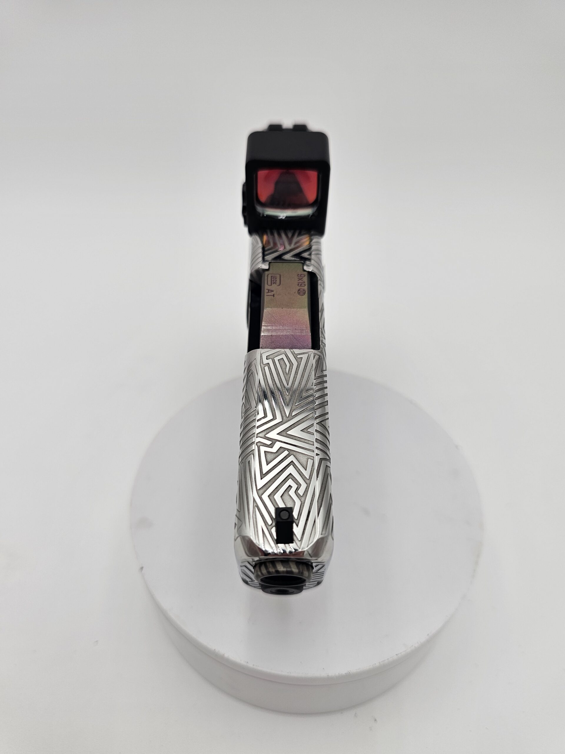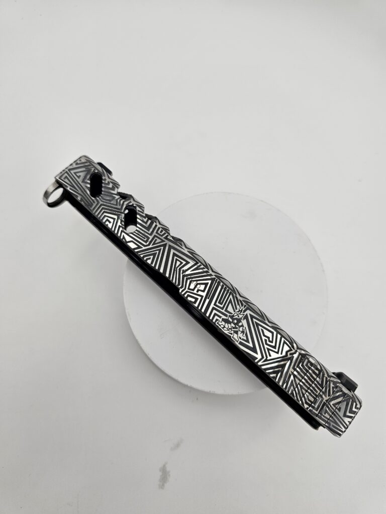 Full-coverage laser engraving on pistol slides. Patriotic patterns, geometric designs, scrollwork, and fully custom artwork — engraved with precision on any metal surface.