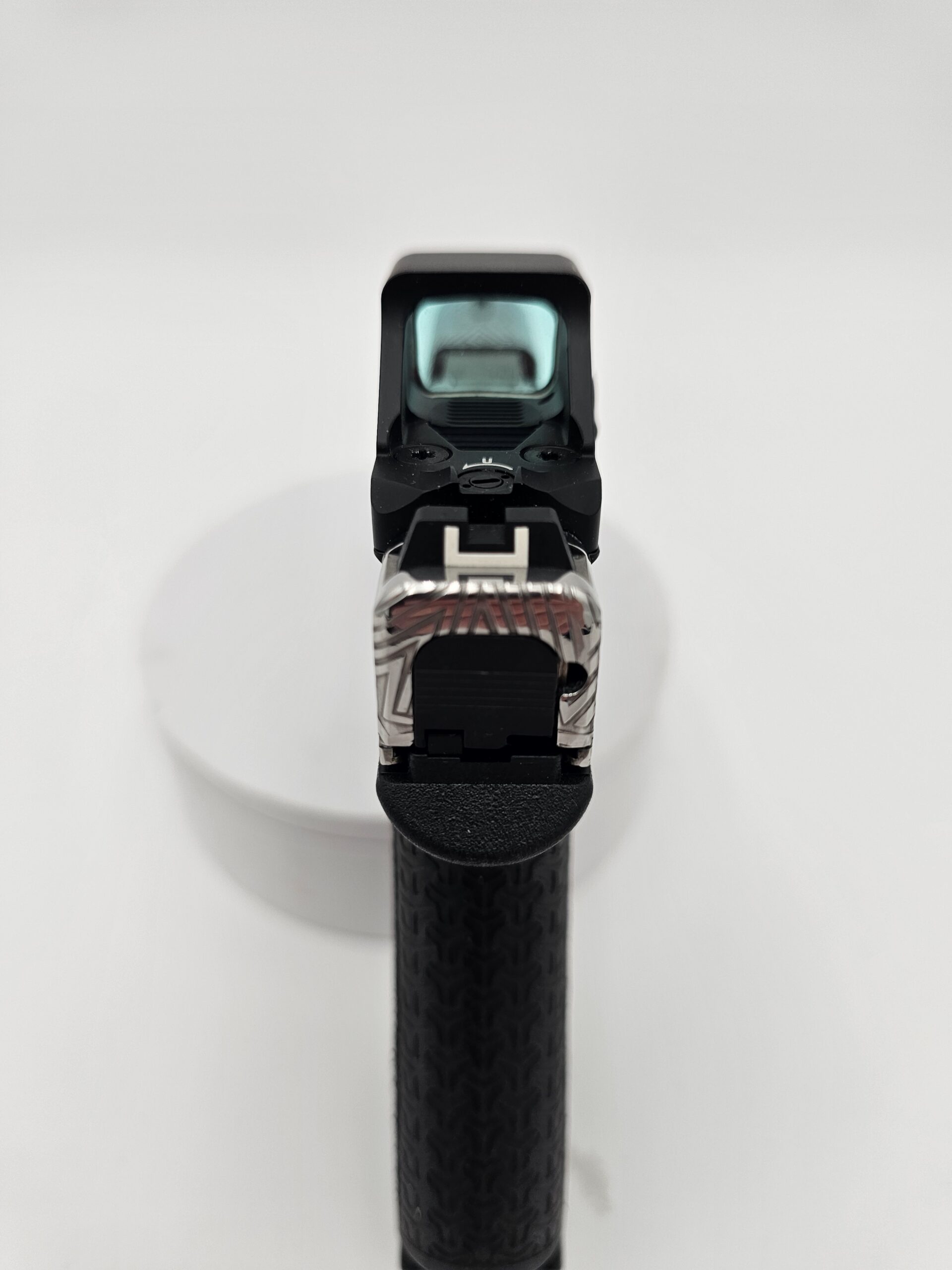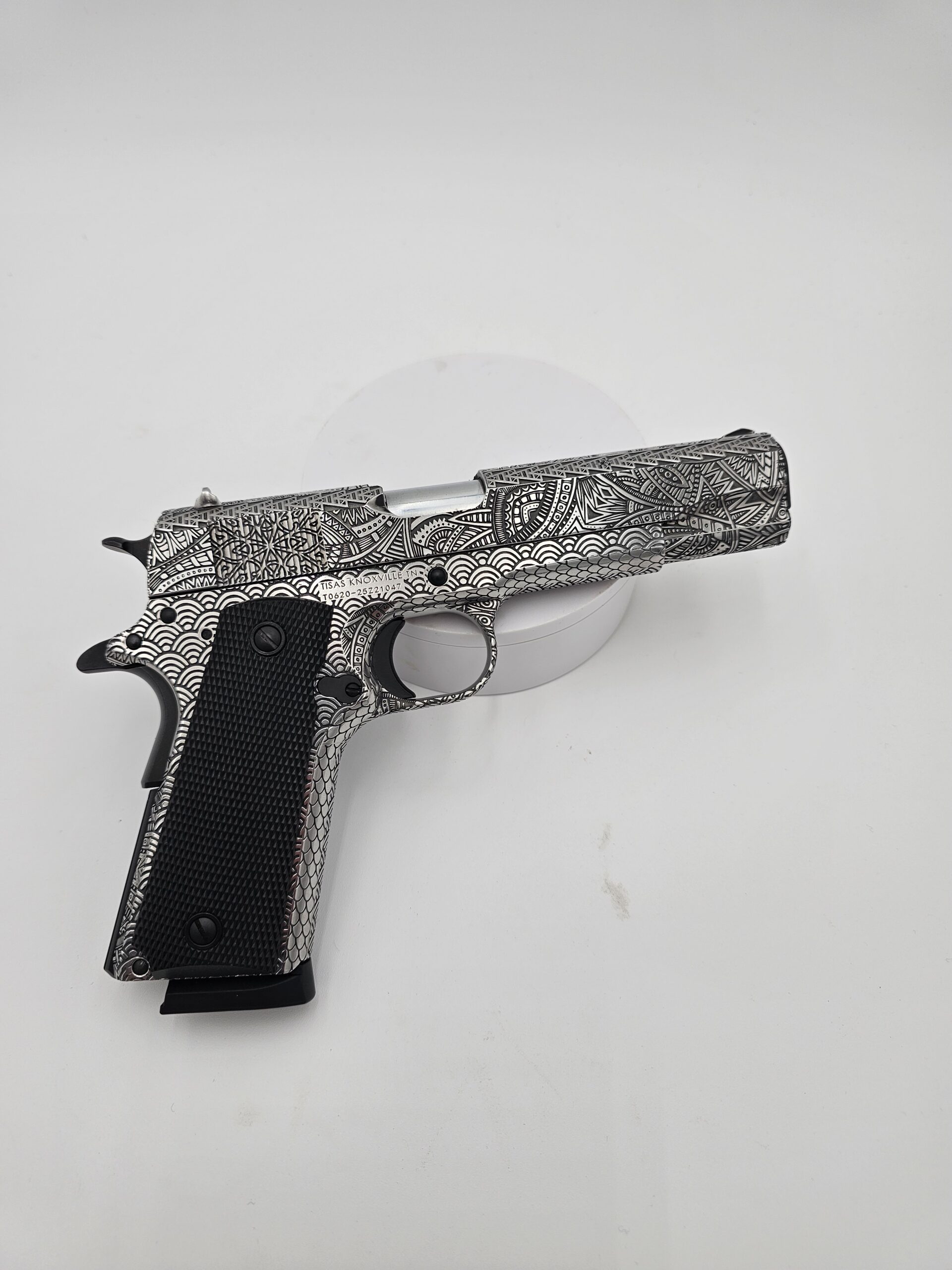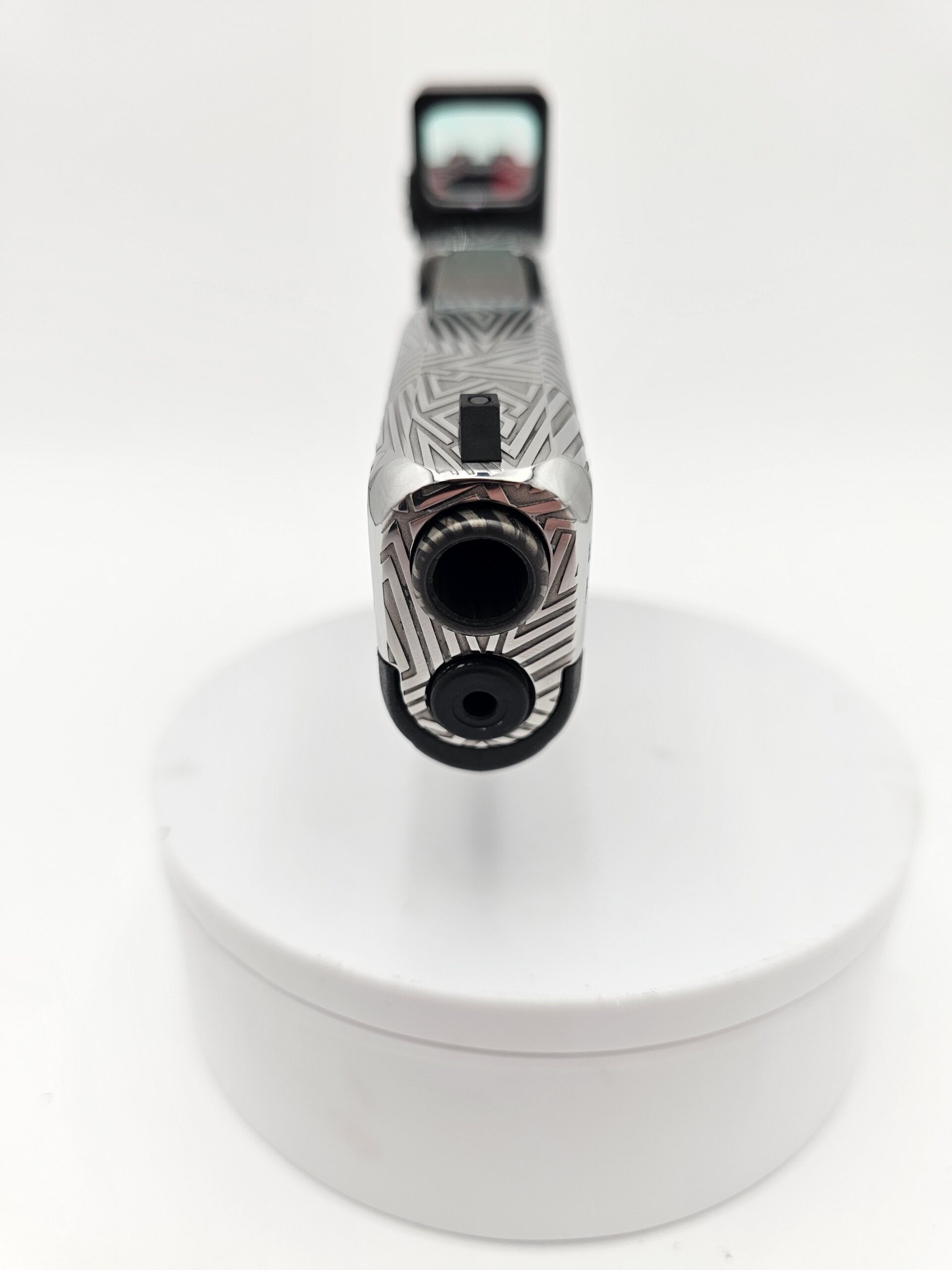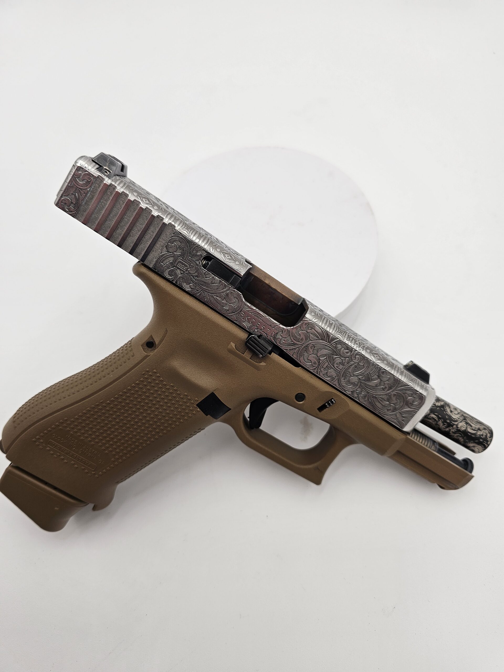 Full-coverage laser engraving on pistol slides. Patriotic patterns, geometric designs, scrollwork, and fully custom artwork — engraved with precision on any metal surface.